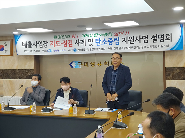 2022. 11. 22(화) 14시부터 구미상공회의소(회장 윤재호) 3층 회의실에서, 환경안전책임자협의회(회장 진영식)주최 및 경북서부환경기술인협회(회장 도성환) 주관하여 배출사업장 환경기술인 약 50여분과 함께 배출업소 지도사례 및 환경지원사업(탄소중립 지원사업. 스타트 생태공장 구축 지원사업) 설명회를 가졌습니다.